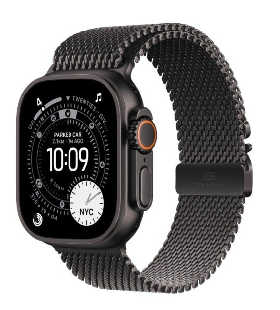 - Apple Watch Ultra 3 z kopertą z tytanu w kolorze naturalnym, widać mapy offline i kolejne wskazówki, zegarek ma opaskę Alpine w kolorze terakoty