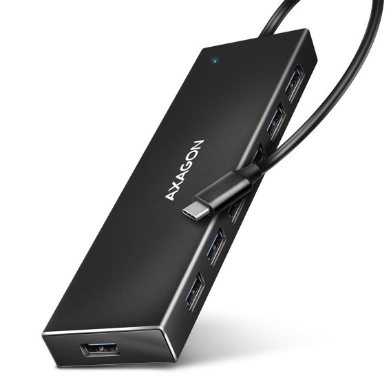 Hub slim USB-C 3.2 Gen 1 (USB 3.0) AXAGON HUE-F7C z kablem USB o długości 30 cm łatwo i szybko podłączy do komputera do siedmiu urządzeń USB jednocześnie. Dzięki szybkiemu interfejsowi USB 3.2 Gen 1 transfer jest obsługiwany z prędkością do 5Gb/s.