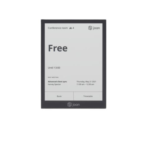 Joan 6 Pro (czarny) tourządzenie nowej generacji przeznaczone do zaawansowanego zarządzania salami konferencyjnymi, chrakteryzujące małym poborem mocy (pobór mocy 99% mniej niż ekrany LCD) oraz niewielką grubością panelu. Można go zamontować bezprzewodowo za pomocą magnesu Smart lub przy użyciu (opcjonalnej) w pełni okablowanej stacji dokującej PoE. Zastosowany w Joan 6 Pro uchwyt magnetyczny jest przypisany do określonej sali konferencyjnej, dzięki czemu, po przymocowaniu panelu, wyświetli automatycznie dane o tym pomieszczeniu.