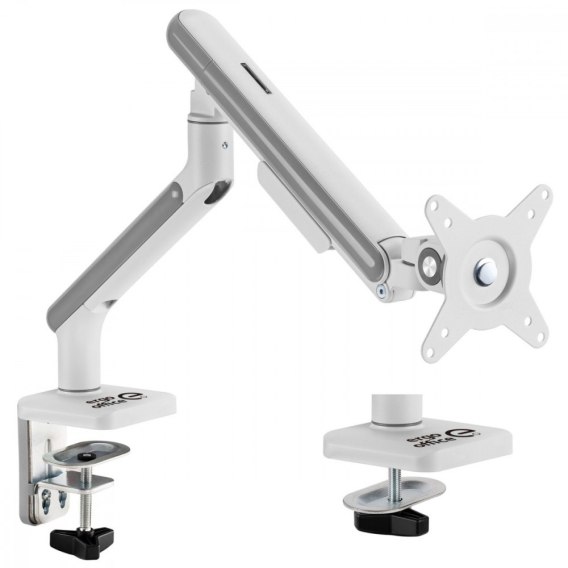 Uchwyt wyposażony jest w sprężynę gazową umożliwiającą płynną regulację wysokości monitora. Dzięki temu można łatwo dostosować położenie monitora do swoich preferencji, podnosząc go lub opuszczając w zaledwie kilka sekund. Uchwyt wykonany jest z trwałych materiałów, które gwarantują stabilność i bezpieczeństwo monitora. Solidna konstrukcja pozwala na umieszczenie monitorów o przekątnej do 32'' bez obaw o ich bezpieczeństwo. Nowoczesny i schludny wygląd uchwytu sprawia, że doskonale komponuje się z większością biurowych lub domowych wnętrz.